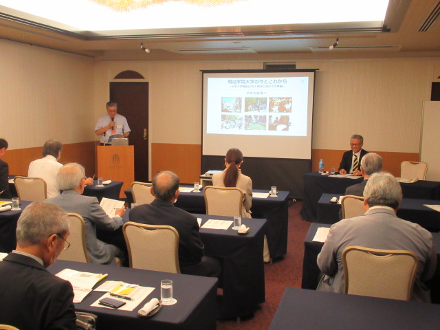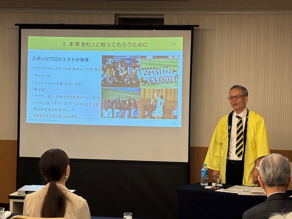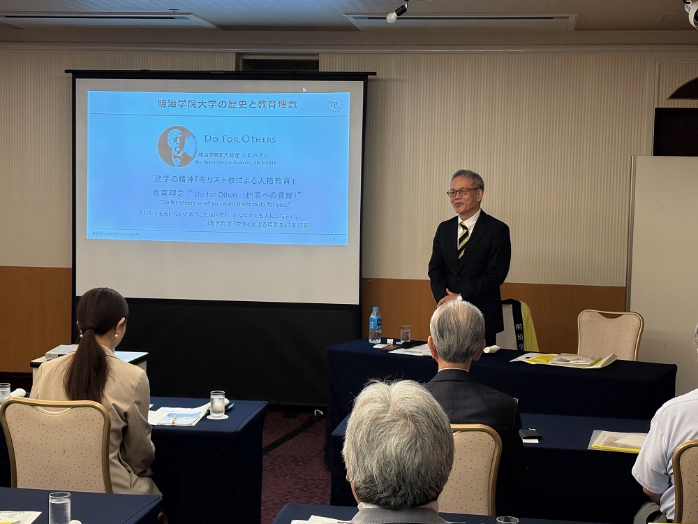 はじめに、岡明 秀忠(おかみょう ひでただ)副学長よりご挨拶と、「明治学院大学の今とこれから ~大学入学者数50万人時代に向けての準備~」と題しまして、現在の明治学院大学の現況についてのプレゼンテーションを行いました。
